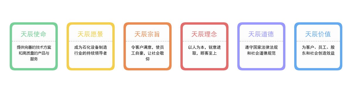 天辰使命:提供最佳的技術方案和最高質量的產品與服務;天辰愿景:成為石化設備制造行業的持續領...